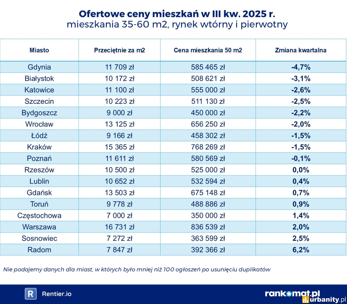 Do grupy miast bliskich „dziesięciotysięcznikom” należą Toruń (9 778 zł/m²), Łódź (9 166 zł/m²) i Bydgoszcz (9 000 zł/m²). W segmencie mieszkań o powierzchni 50 m² najwyższe stawki obowiązywały w Warszawie (837 tys. zł), Krakowie (770 tys. zł) i Gdańsku (675 tys. zł). W najtańszych lokalizacjach - Radomiu, Sosnowcu i Częstochowie ceny wynosiły od 350 do 390 tys. zł.