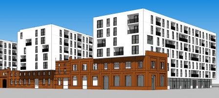 - kompleks czterech budynków połączonych częścią niską mieszczącą garaże wielostanowiskowe w dwóch poziomach