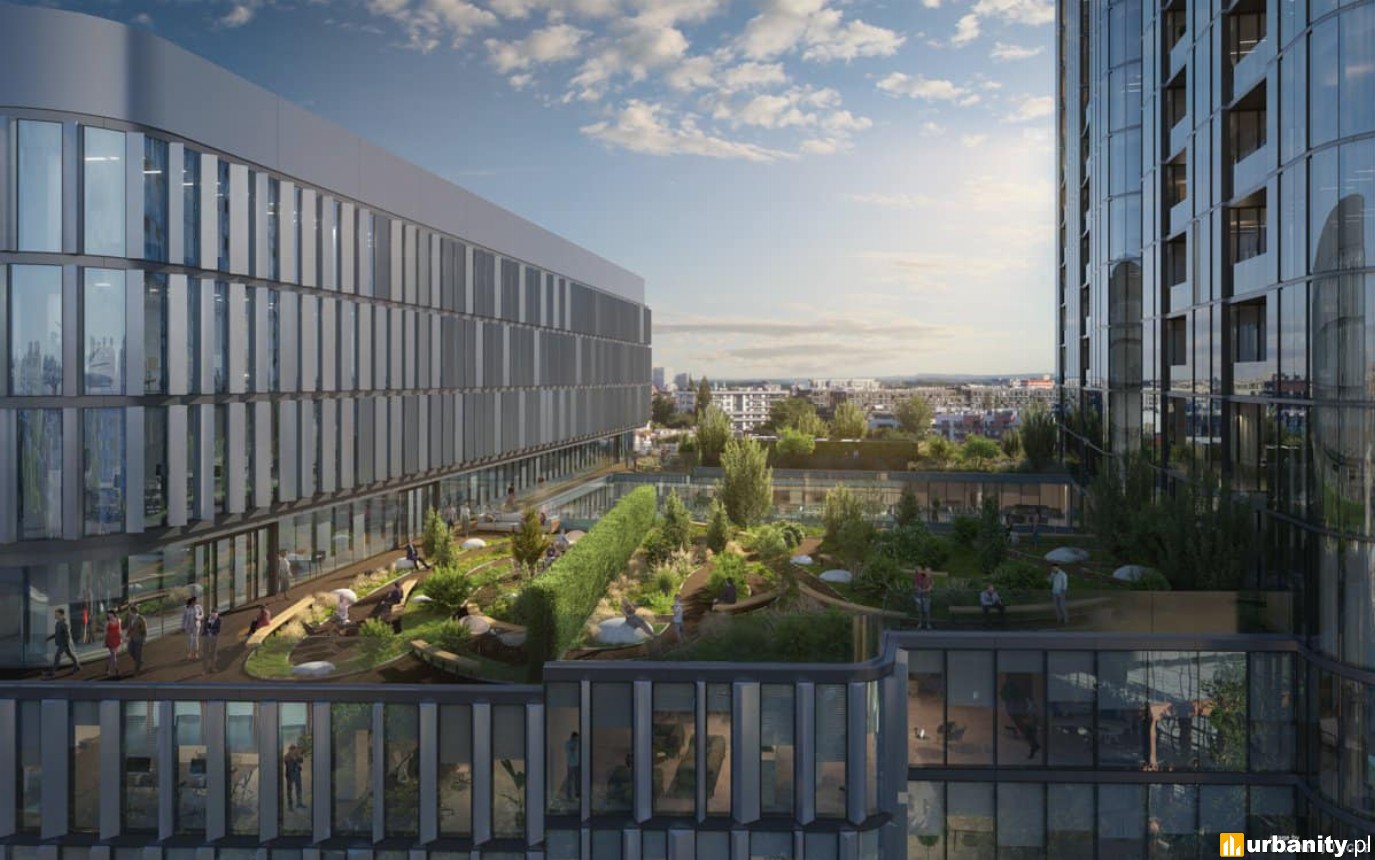 Z prawej strony widać projekt nowej wieży mieszkalnej kompleksu Quorum, wiz. materiały inwestora