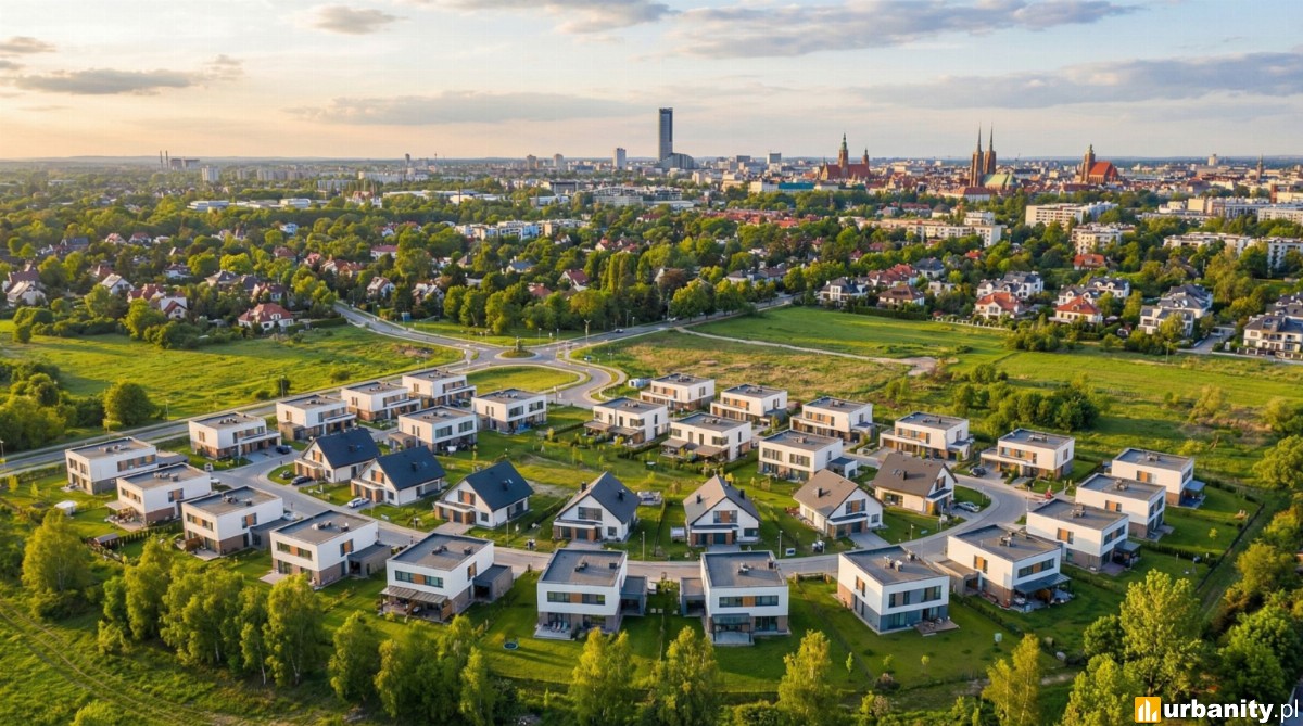 Panorama Wrocławia z nowoczesnymi osiedlami domów jednorodzinnych na pierwszym planie, pokazująca atrakcyjność regionu dla budownictwa mieszkaniowego