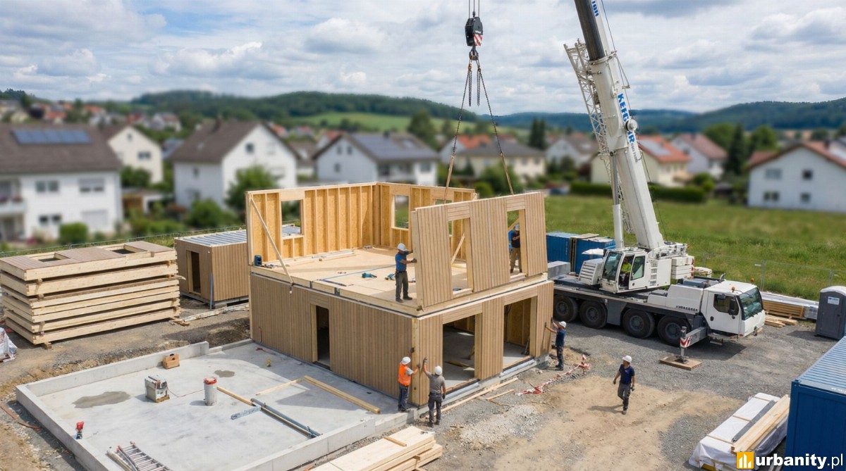 Proces montażu domu prefabrykowanego z widocznym żurawiem ustawiającym gotowe elementy ścian, pokazujący szybkość i precyzję procesu budowlanego