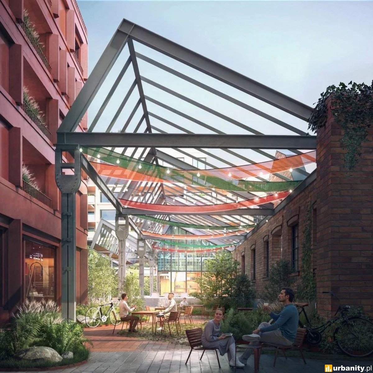 Centralnym elementem założenia będzie zabytkowa hala szedowa, wpisana do gminnej ewidencji zabytków. Obiekt zostanie częściowo zrewitalizowany z zachowaniem historycznej konstrukcji. Pod charakterystycznymi dachami zaplanowano ogólnodostępną, półotwartą przestrzeń zieloną z funkcjami gastronomicznymi i rekreacyjnymi, która ma pełnić rolę lokalnego miejsca spotkań.