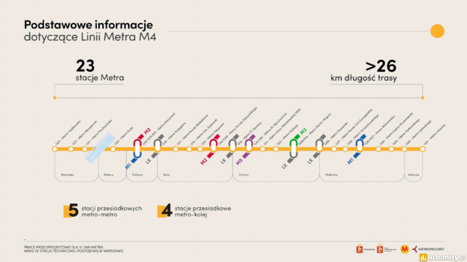 Planowana linia M4 ma liczyć ponad 26 kilometrów długości i obejmować 23 stacje. Trasa połączy Białołękę z Wilanowem, przebiegając przez dziewięć dzielnic i przekraczając Wisłę, linie kolejowe oraz główne arterie drogowe. W północnej części miasta powstanie zaplecze techniczne wraz z tunelami dojazdowymi.