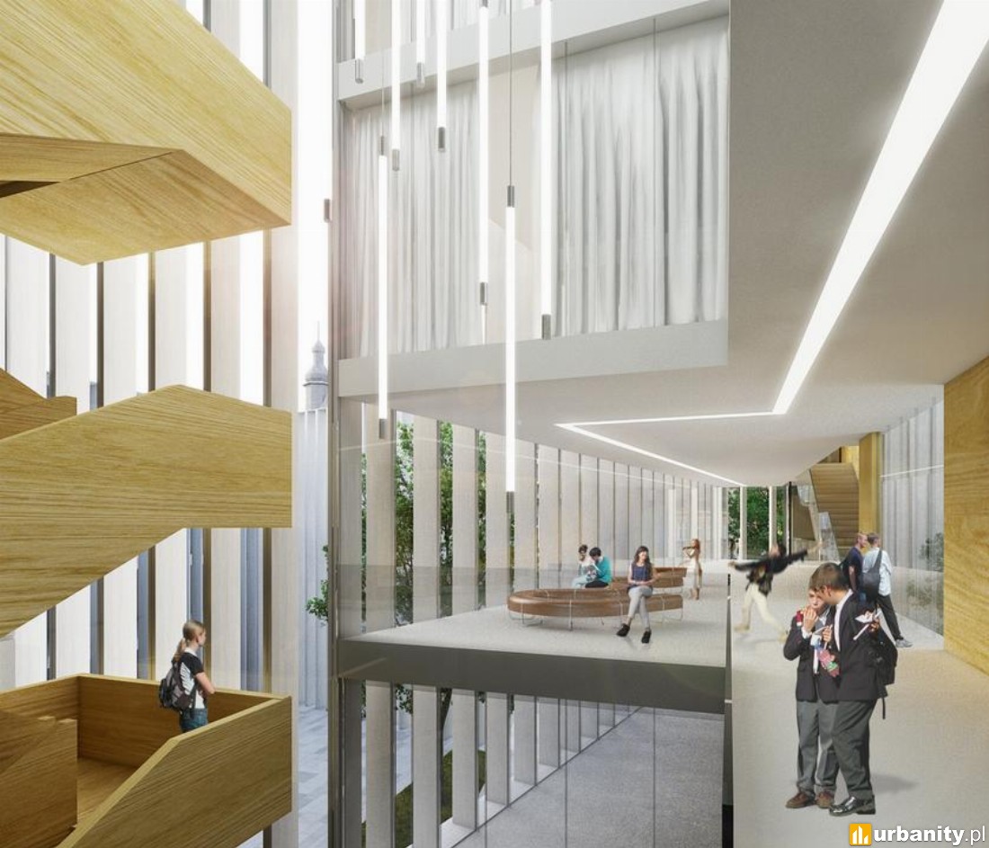 - wewnętrzny dziedziniec zaprojektowany jest jako centrum szkoły i zielony skwer, zaś sala koncertowa i kameralna zlokalizowane są miejscach odizolowanych od ulicznego hałasu